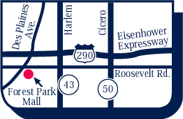 Forest Park 708-366-3886 Forest Park Mall 7600 West Roosevelt Road From East: I-290 to Des Plaines Ave., right to first light, left on Roosevelt Rd., to second light, right into shopping center. - or -From West: I-290 to Harlem Ave., south to Roosevelt Rd., west to second light, left into shopping center. We are next to the Big K-Mart. |