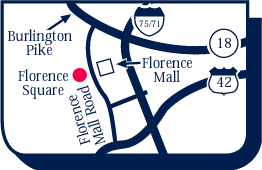 Florence 606-647-0427 Florence Square 7665 Mall Road I-75 (North or South) to the Florence/Burlington Exit (Rt. 18), west on 18 (Burlington Ave.) approx. 1/4 mile, left onto Mall Rd., to light and turn right into Florence Square. We are next to Barnes & Noble. |