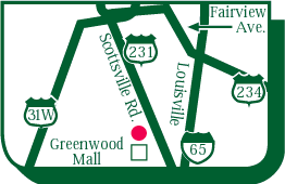 Bowling Green 270-843-3585 Greenwood Mall 2625 Scottsville Road, #300 I-65 to #22 Exit (Hwy. 261), east one mile to the Greenwood Mall, left into the mall. We are on the east end of the mall. |