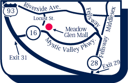 Medford 781-396-1777 Meadow Glen Mall 3850 Mystic Valley Parkway I-93 south to Exit 31, left on Rt.16, left on Locust St. We are in Meadow Glen Mall. - or - I-93 north to Exit 29 to Rt. 28 north at Wellington Circle, left on Rt. 16, one mile. to mall on the right. |